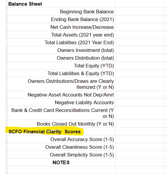 This sheet is for the Financial Clarity Assessment: This allows us to get a high level analysis of the books and what their financial story is: what is going okay and where the focus needs to be. This also helps us evaluate their bookkeeping team, where they were vs where they want to be. Finding the GAP. The GAP is finding where they are and where they want to be (helps to measure KPIs to get there). I highlighted the SCFO Financial Clarity Score because that is key to our assessment.