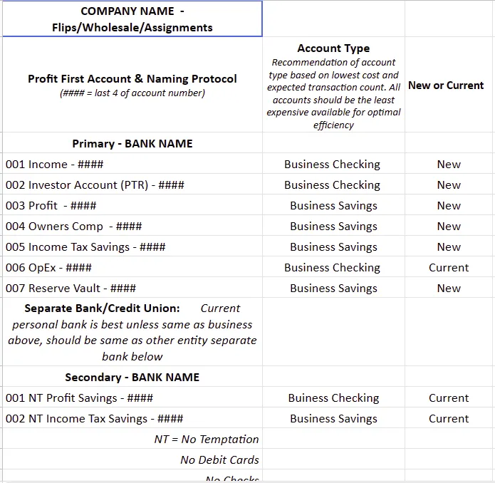 This sheet is where we track bank accounts and which entity and just overall Profit First implementation items.