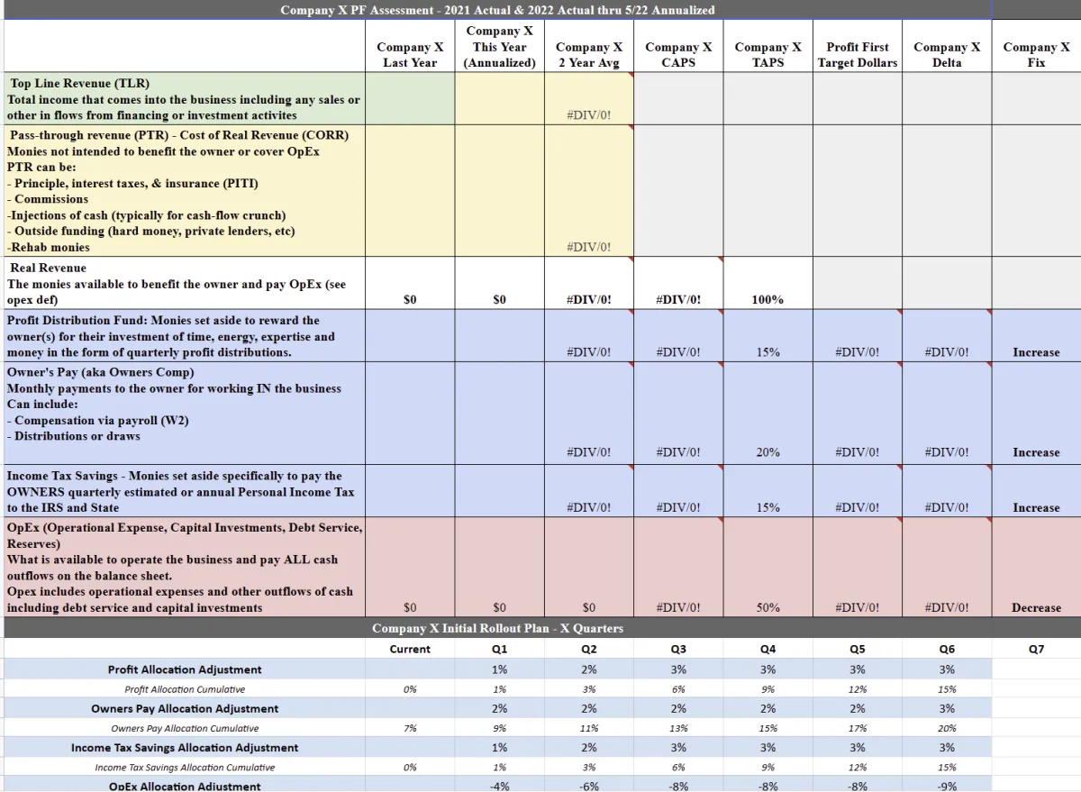 This is the Initial PFARP – Profit First Analysis and Roll-out Plan. We do this every quarter or more often if necessary. This tells us how they are spending money and where they NEED/WANT to spend money. We explain this in detail as part of the full Profit First Implementation. It is a big eye opener on how they are spending money and where they want to be. The roll-out plan at the bottom is the baby steps to get them to the goal.